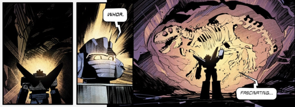 Wheeljack, Jazz and Magnus take Soundwave back to the location where the Autobot base used to be, before the Ark disappeared thanks to Thundercracker and Skywarp back in #21. Quite what the plan was to secure their prisoner here is anyone’s guess. Still, regardless, it leads Wheeljack to explore the now-empty cave and stumble across some ancient fossils, including those of a Tyrannosaurus. Even the most casual of Transformers fans will know this is a surefire hint that Grimlock and the Dinobots might be making a debut in the book before too long. Assuming they follow their cartoon origin, we can expect them to be new robots constructed by the Autobot scientist from scratch. However, Skybound might tweak that formula somewhat, for all we know!