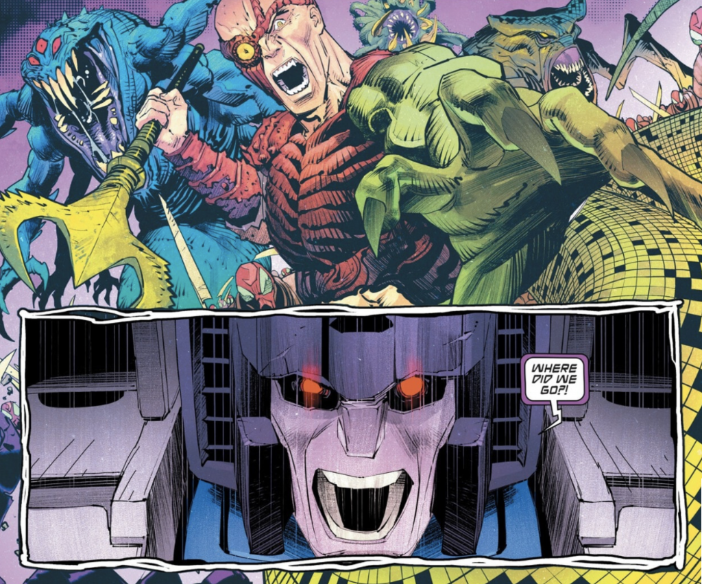 As Jazz and Wheeljack get Soundwave under lock and key back at the Ark, they suddenly notice that Ultra Magnus is nowhere to be found. However, before they can go looking, they’re pounced on by an erratic and crazed Thundercracker, who is screaming out loud about horrible creatures unlike any he’s ever seen and asking where they went – presumably in reference to the trip he took with Skywarp. We get a brief flash of this location, which is enough to clue in established readers, as the Energon Universe is once again set to bring the weird world of Cobra-La back to the fore! How this Himalayan civilisation will tie in with everything else going on here remains to be seen. Still, it’s fair to say there are plenty of varying elements being woven into Transformers, by this point.