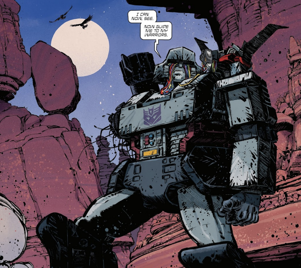 Speaking of Megatron, what about the despicable Decepticon despot himself? Again, his robot mode is essentially the same as his classic ’80s animation model. However, there’s little doubt that artists like Jorge Corona have given it a highly stylised polish on the page! Yet for this list, it’s the very particular look he’s sporting after returning to main cast duty at the end of #16 that we’re talking about. One arm, wires hanging out, eye sockets attached to Laserbeak on his shoulder – it’s a distinct vibe, to say the least. Again, there have been some exceptional custom efforts of this one already, but like Optimus, it could be highly enjoyable to see it made real officially. Bonus point if they can incorporate his weird tank-styled gun mode in some form, which could theoretically be possible with an SS86 retool…