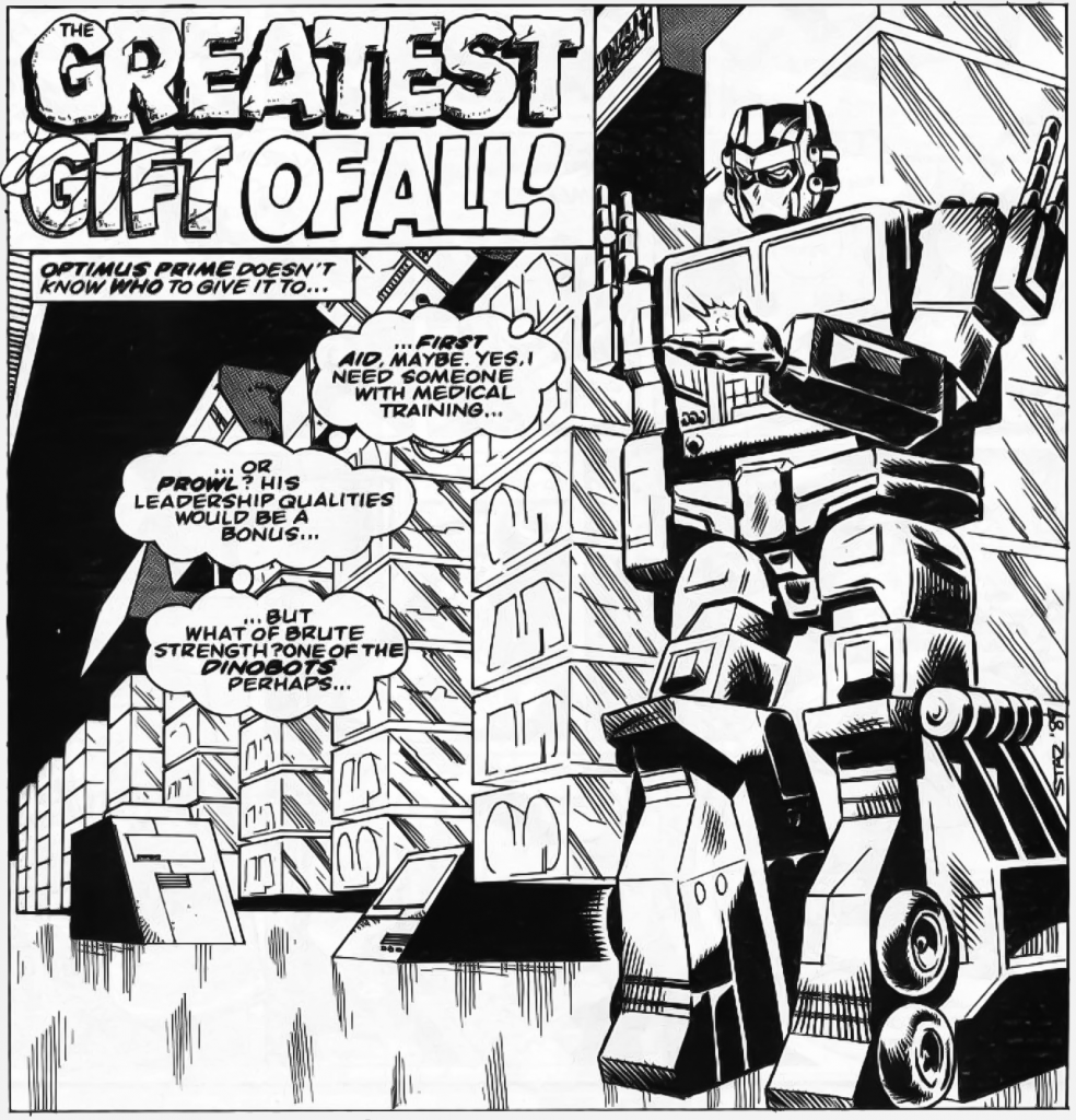 Published in Marvel UK’s The Transformers #250 and cover-dated December 1989, The Greatest Gift of All is a short black & white B-story written by Simon Furman, with art by Staz Johnson. It arrived right at the end of the decade, at a point where the UK comic’s exclusive material was about to move away from its long-running ties to the US continuity, and it also had the distinction of being the last non-prose Christmas strip Marvel UK would ever publish. A small footnote, perhaps, but a poignant one all the same.