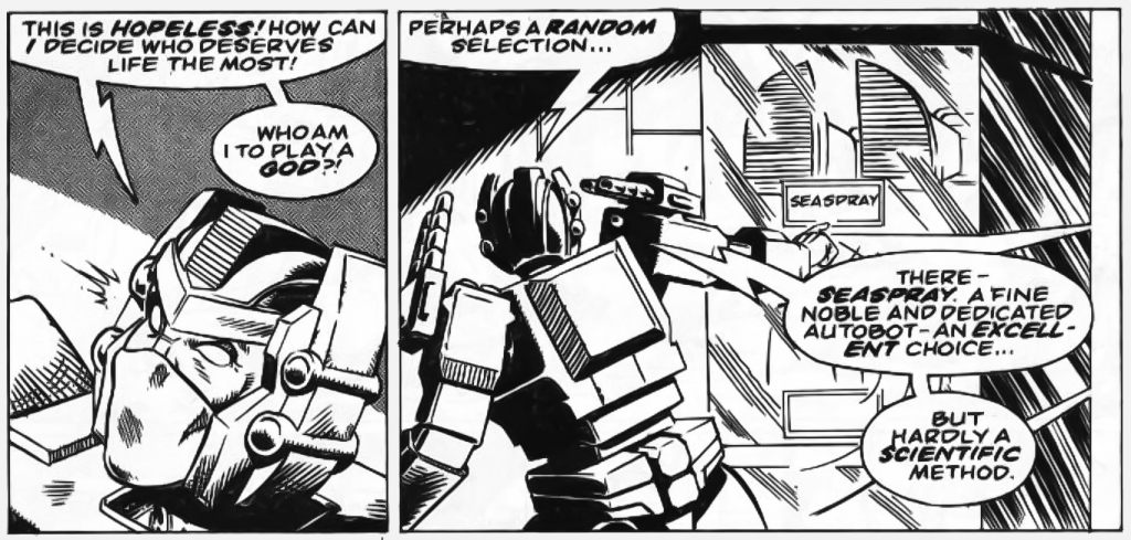 Optimus briefly toys with the idea of making the decision arbitrarily, even settling on Seaspray simply to remove intent from the process. Yet that, too, feels hollow, as randomness doesn’t absolve responsibility — it merely disguises it.