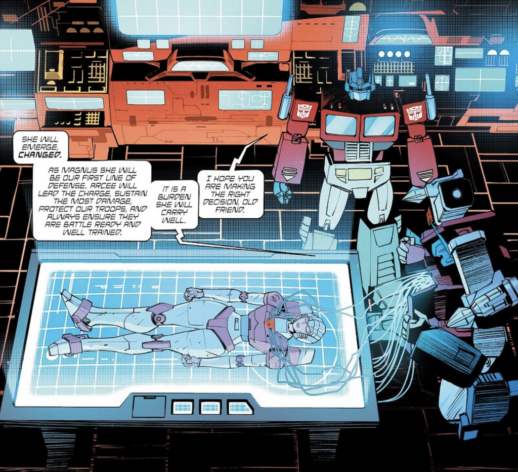 We see that externally, she’s hooked up to Ultra Magnus by a series of wires, as he explains to Optimus Prime that as the new Magnus, Arcee will be the first line of defence — leading the charge, sustaining the most damage, protecting their troops, and ensuring they’re always battle-ready and well-trained.