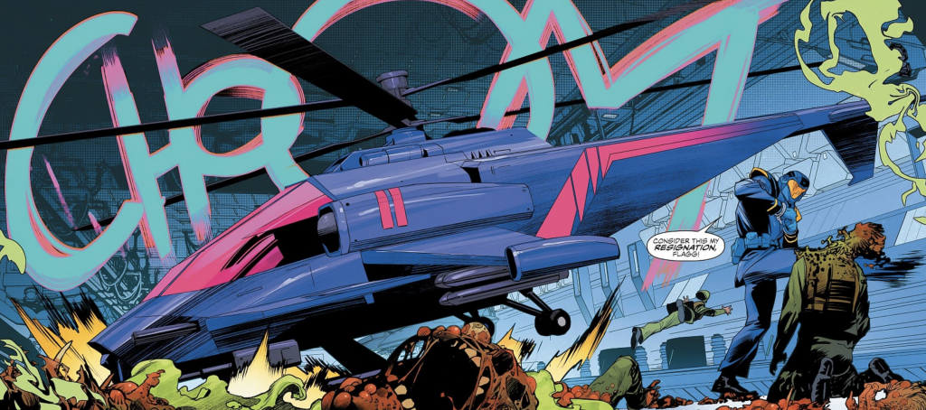 He then summons an impressive helicopter — which M.A.S.K. fans will instantly recognise as the Switchblade! — and prepares to make his getaway, breaking his shackles and evading Flagg’s efforts easily. He climbs aboard as the helicopter transforms into a jet mode and zooms out of the area at top speed.