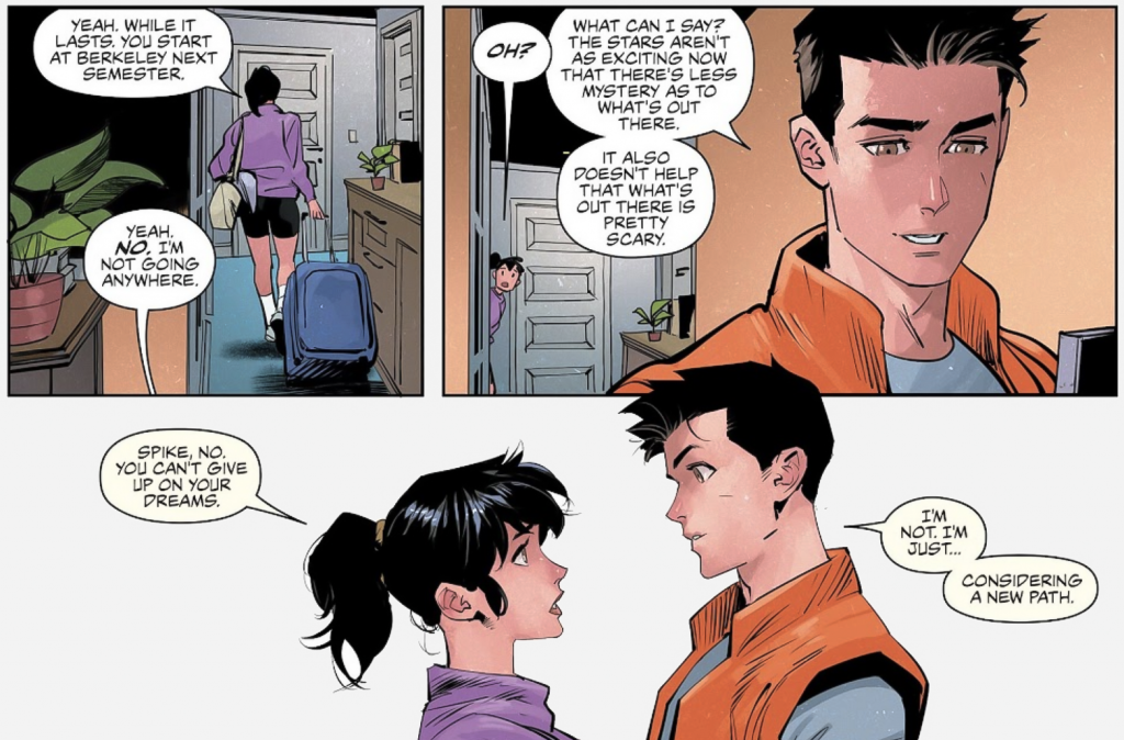 She mentions that Spike will soon be going to university, but he explains he’s having second thoughts, having lost his curiosity about space since meeting alien robots, and that he’s now considering a new path. What that might be, we’ll have to see, but it’s an indication that Kirkman has further plans for these human characters yet.