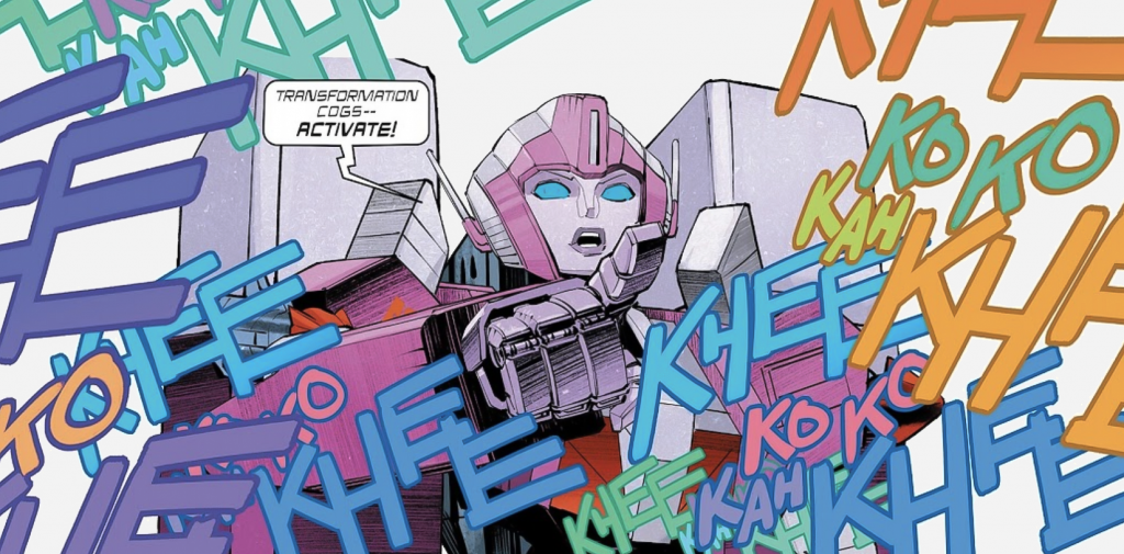 Next, we catch up with the Autobots as Arcee undergoes some visions of her own — though in this case, it’s a planned event. She’s completing a mental quest in an effort to become the Autobots’ new Magnus, after Ultra Magnus nominated her for the responsibility last issue.