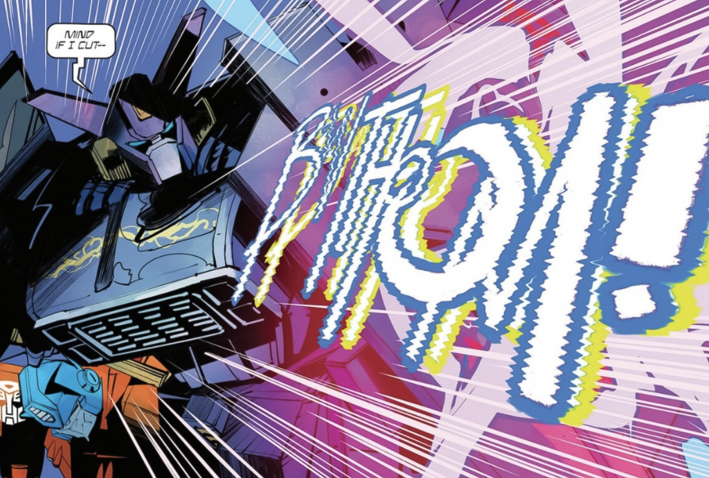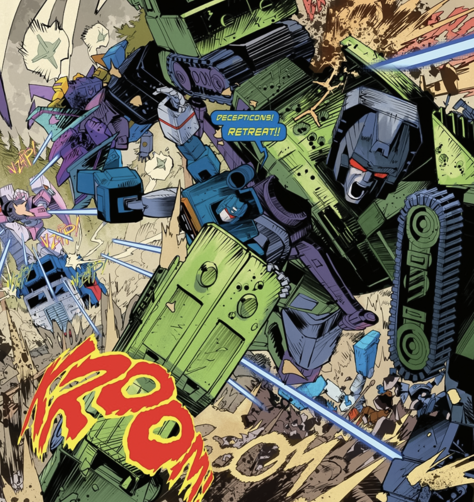 Megatron briefly claims the upper hand in the conflict, turning his fusion cannon on Prime, before Shredhead arrives on the scene and seemingly saves the day. In truth, this moment was a little confusing on first read, if only because it took more than one pass to discern what was actually happening here — but it appears as though Megatron’s blast bounces off Shredhead’s shield.