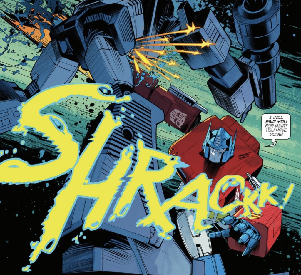 However, the moment is interrupted by the arrival of Optimus Prime, who immediately goes on the offensive (eh?), enraged by what his enemy has done. This feels like a very different side to the Autobot leader than we typically see — perhaps more in line with the battle-ready warrior he once was, and that has so often been teased in the dialogue of previous issues.