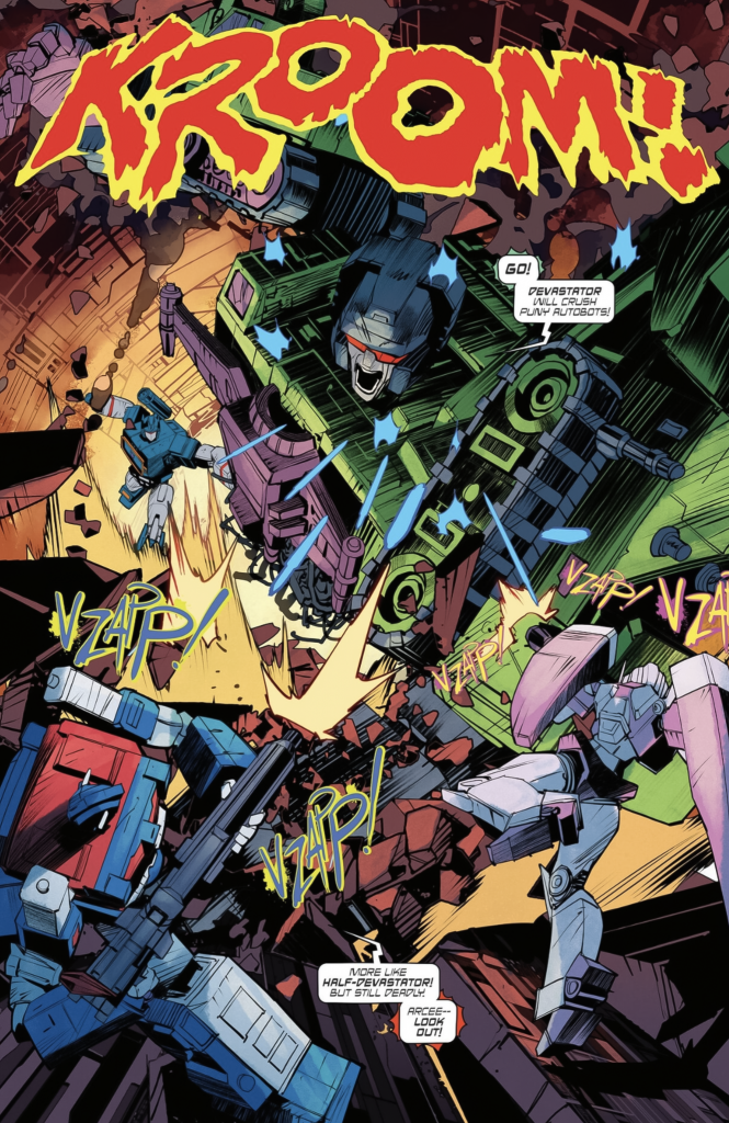 The Autobots hold their own until Hook orders his teammates to merge into Devastator — or the top half of him, at least! It’s an enjoyable twist, even if it somewhat flies in the face of how combiners are traditionally supposed to work, given that they’re typically presented as a merge of the individual minds, not just the bodies.