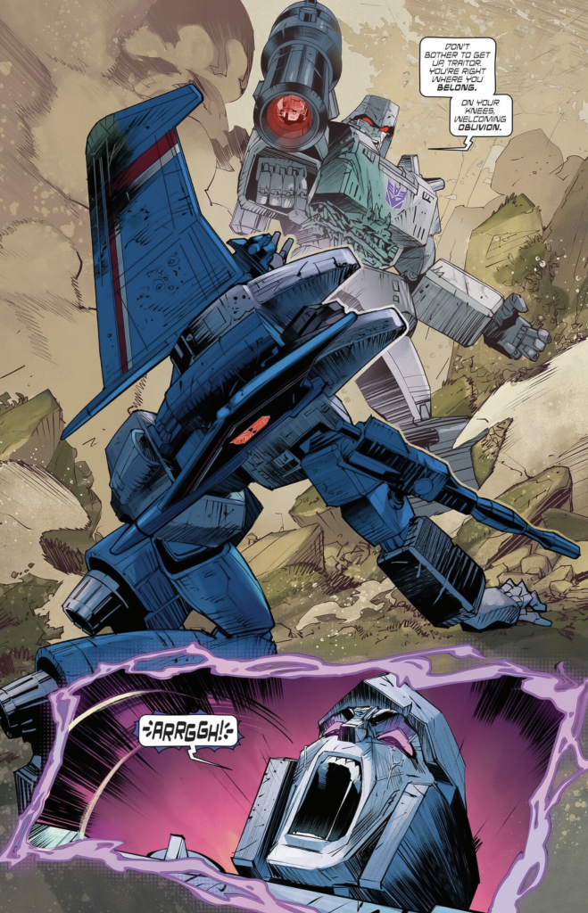 The dust settles for a moment as Megatron has a downed Thundercracker in his sights, pointing his fusion cannon at the newly-minted Autobot with lethal intent. However, the moment is interrupted by Megatron experiencing another seizure, much as he did at the end of #26.