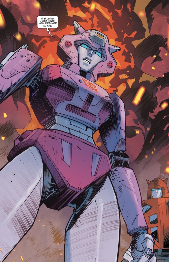 This picks up after we saw the latter’s mission into Decepticon territory in #27 to find components to repair the Spacebridge, so clearly they were successful. Elita darkly declares that the Decepticons should be left to rule Earth, which she calls a “planet of mud,” before saying Optimus needs to answer to her.