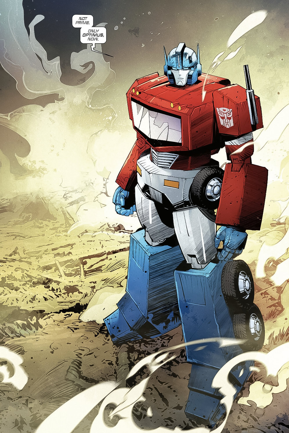 For as much as there is to say about Elita Prime, Optimus’ reduced, powered-down form was arguably just as much of a surprise — after all, he’s not Orion Pax! Whilst that pre-Prime identity was once fairly niche knowledge, familiar mainly to devotees of the classic cartoon, it has since become firmly established across the franchise’s wider media — a significant part of the IDW comics and, of course, front and centre in Transformers One. Given how integral it was to that recent big-screen adventure, it’s honestly astonishing that Skybound hasn’t leaned into it here, particularly in an era of maximum brand synergy.