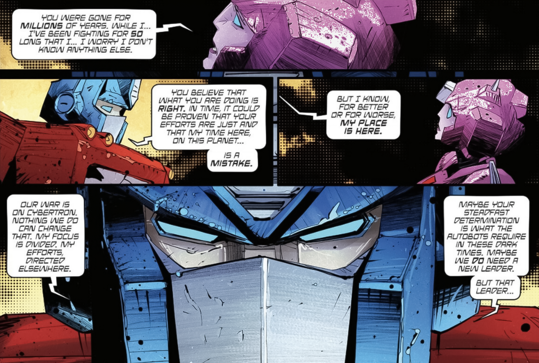 Meanwhile, it’s tempting to say that parts of this story go some distance in painting Elita as the villain, or at the very least casting her in an unsympathetic light — she is the aggressor here, after all, with a seemingly callous regard for the plight of planet Earth, to say nothing of her attempt to seize the Matrix by force. However, it’s impossible to ignore her backstory: she has been facing increasingly desperate odds on Cybertron for millions of years, watching many of her comrades be destroyed in battle. Taken out of that context, her actions may seem compassionless or even outright hostile — but from her perspective, she is simply trying to defend her homeworld and free her people in the most direct manner available to her, even if that comes with the knowledge that Earth will be decimated in the process.