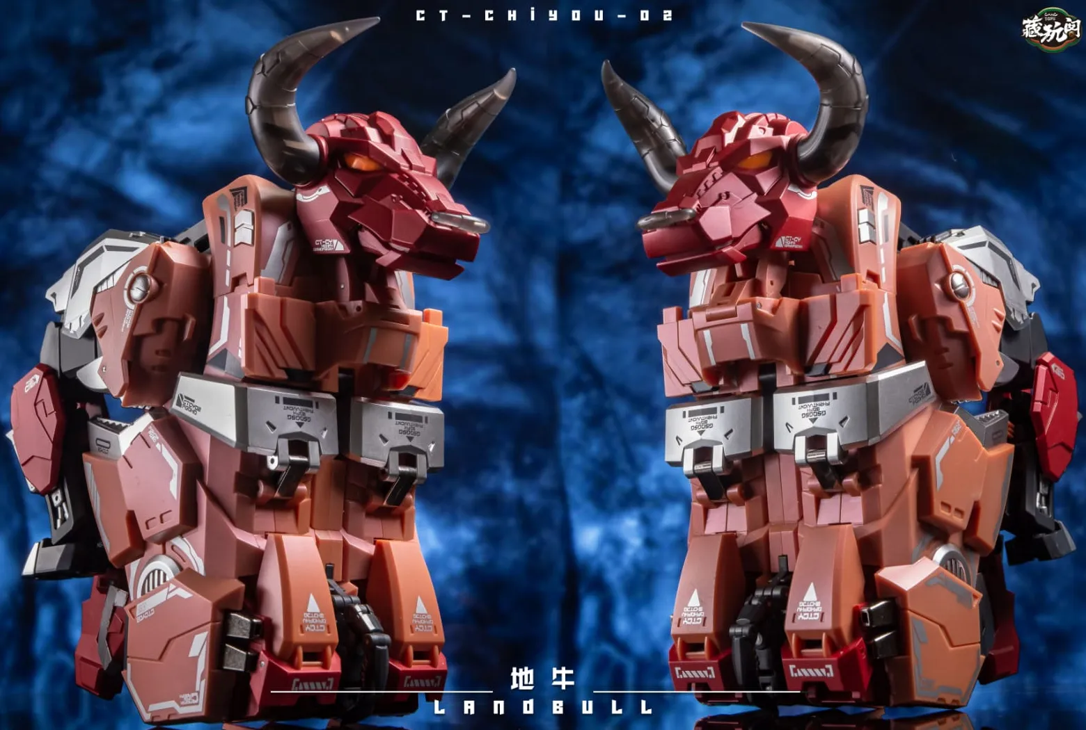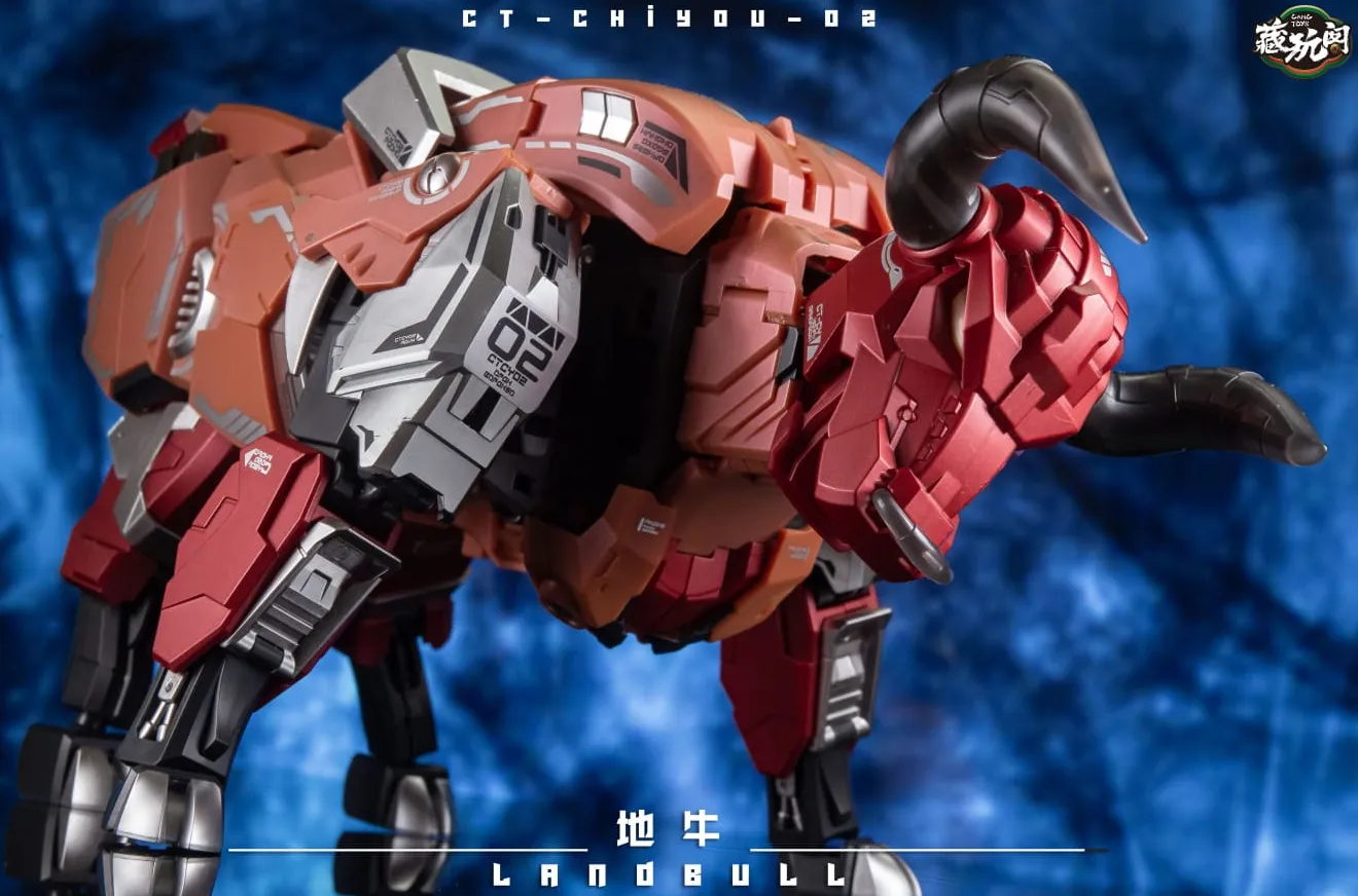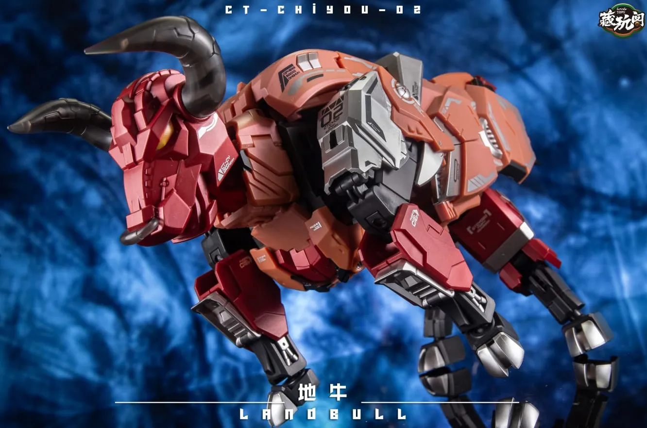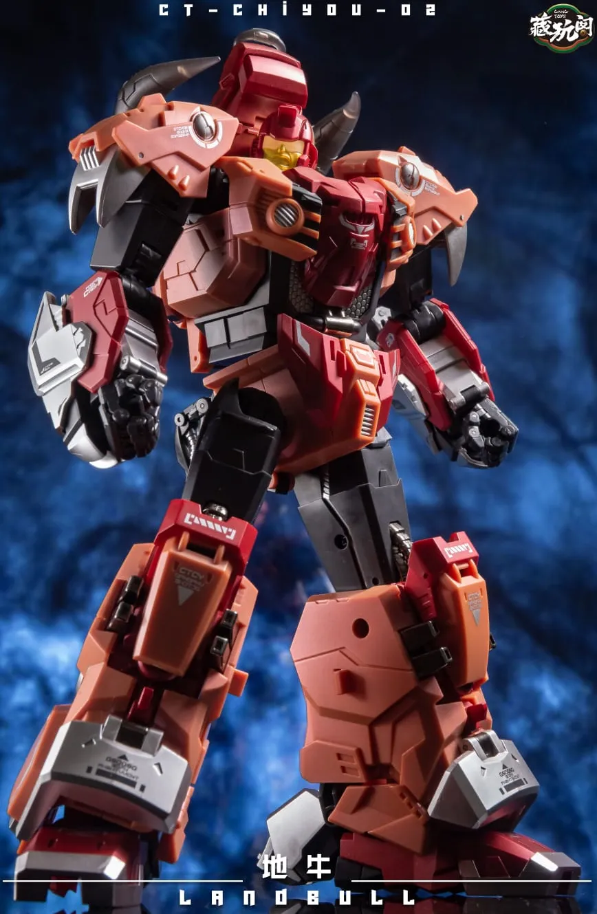 The second to join Cang-Toys' transforming figure series is the CT-Chiyou-02 Landbull! Landbull stands about 9 inches tall in robot mode and comes with a double barreled blaster and sword for weapons. Made of high quality ABS plastic, Landbull transforms from Bull to robot and back, and is highly articulated and features a complex transformation. Along with the other 4 members (sold separately) they combine together to form one massive robot.