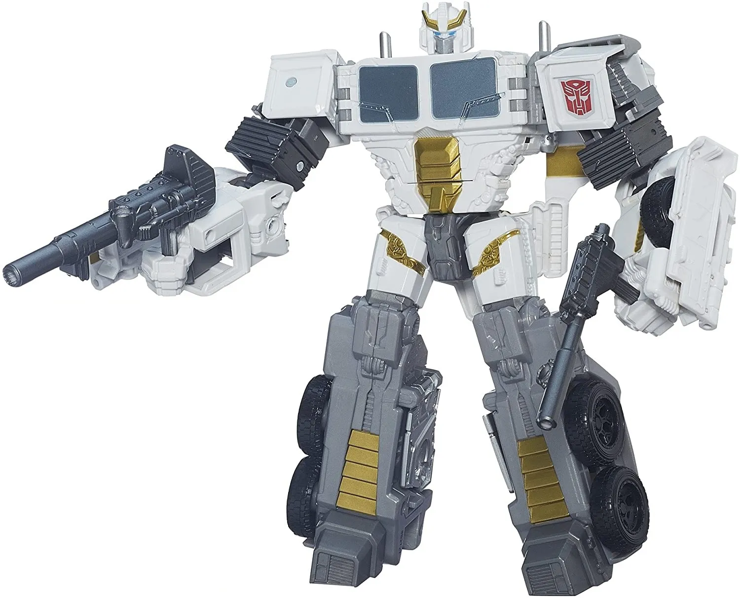 Optimus Maximus transforms from robot to Semi Truck and back and includes his respective weaponry. Each Combiner Wars figure allows for an infinite amount of combining action as the joints of Voyager Class figures allow Deluxe figures to be interchanged to assemble together. Choose your favorite Decepticon or Autobot Combiner or mix and match figures as desired based on the original 80's Scramble City G1 Transformers concept.