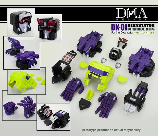 DK-01 Upgrade Kit for Transformers Combiner Wars Devastator is perfect upgrade to your Transformers Transformers Combiner Wars Titan Class Devastator (figure sold separately). Included are all new articulated hands, two alternate face plates, alternate head with flip down goggles, new attachments and weaponry and more! Set is compatible with Hasbro, Takara/Tomy and SDCC versions of Combiner Wars Devastator (not included).