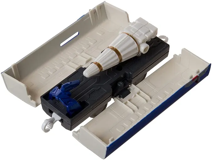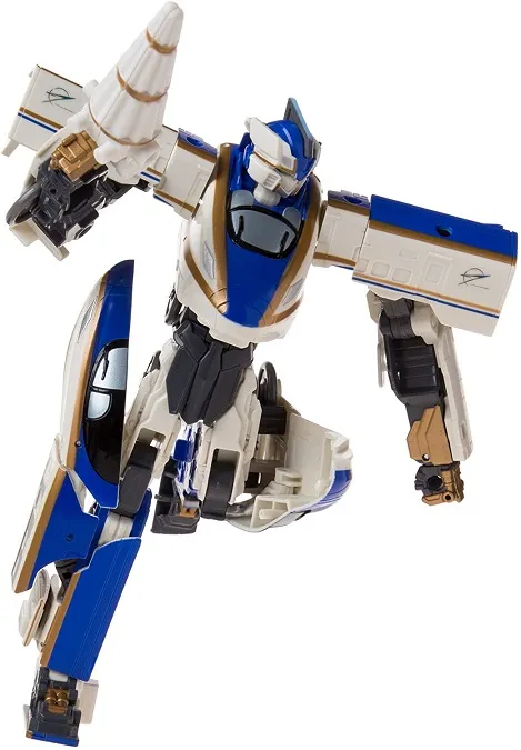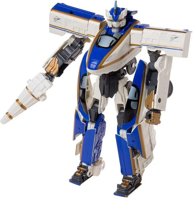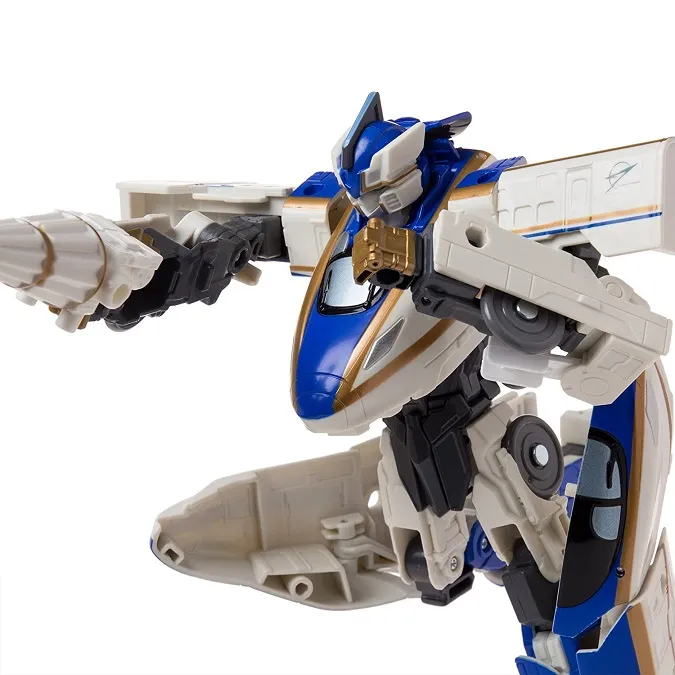 From the animated series Shinkansen Henkei Robo Shinkalion, this figure is composed of 3 separate train cars. The front and end train cars combine to create the robot mode for Kagayaki, while the middle car opens up to store his weapon and crown accessory.