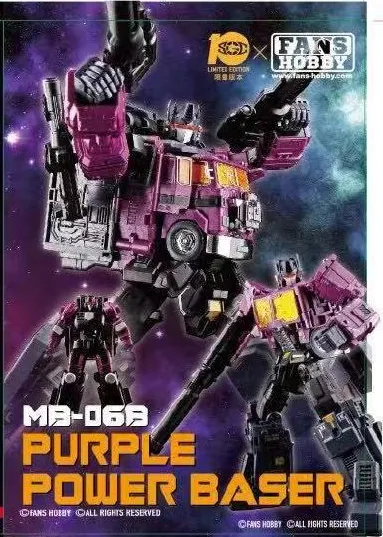 Fans Hobby - Master Builder - MB-06B Purple Power Baser - LE by Fans Hobby is Masterpiece Scaled and ABS & Die-cast parts! This figure is limited to 500 pieces worldwide and is the SGC 10th Anniversary show Convention Exclusive Piece. MB-06B Power Baser stands 12.5"/32CM tall in robot mode and transforms into an armored truck and trailer, to robot and back! Black Power Baser features an adjustable bumper part - for a better body shape in combined mode and articulated hands. Best of all those who preorder the first edition release of this figure will receive a SPECIAL GIFT - Matrix with black chrome plating and Amethyst crystal! This will be included in the box with the toy and is a special gift from Fans Hobby to each collector that purchases the first edition release of this figure.