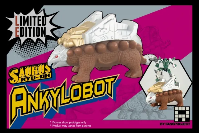 Ankylobot Shell Limited Edition is part of Fansproject's Ryu-Oh combiner toy series, which features 6 dinosaur themed transforming robots that also combine together to fom the mighty Ryu-Oh. Each of the 6 figures and dinosaur shells are sold separately.