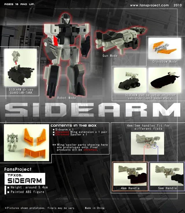 TFX-05 Sidearm who can transform into a gun that can be mounted on the roof of Transformers Classics Hot Rodimus or mounted on the trailer of TFX-04 Protector Trailer Armor Upgrade Kit. Included with this kit are chromed spoilers and wing attachments that can attach to Transformers Classics Hot Rodimus or TFX-04 Fansproject's Protector Trailer Armor Upgrade Kit.