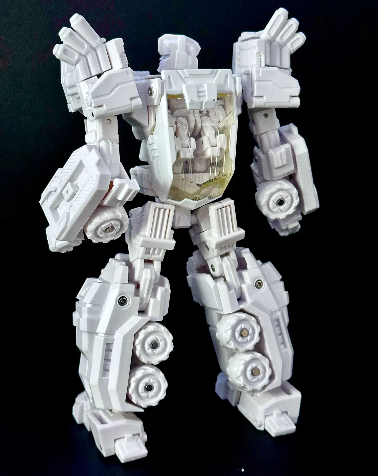 WB-008W First Core is a Voyager-scale 3rd party Transformers-style figure that converts from vehicle mode to robot mode and back. Standing approximately 6.7 inches tall in robot mode, it is part of Fansproject’s Warbot Series, featuring the brand’s signature transforming core system. The core robot converts independently and forms the chest of the main figure, while also functioning as a driver in vehicle mode.