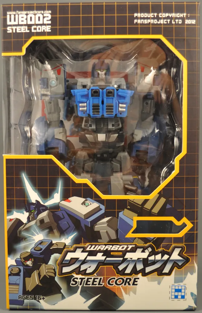 WB002 Steelcore by Fansproject stands approximately 6.7-inches tall in robot mode and is part of Fansproject's Warbot Series of figures. Each figure features a transforming core that also functions as a driver when the main robot is in vehicle mode. Each figure is approximately Voyager scale and features a core or transformable robot that forms the chest or core part of each robot. These individual robots transform from robot to core and back and are interchangable with other Fansproject core robots.