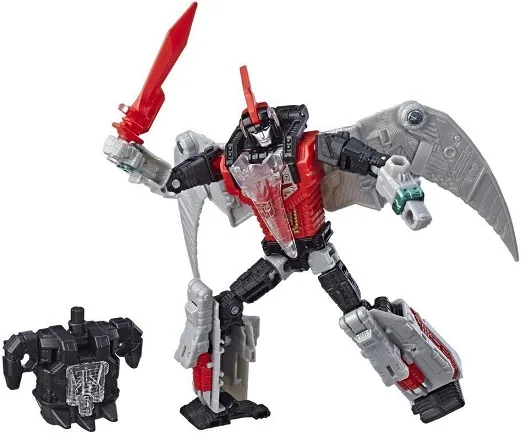 Exclusive! Transformers Generations Selects bring back favorite characters from across the globe as exciting entrants into the Cybertronian Wars. Big robots join the Siege with this Transformers Generations Selects Deluxe Red Swoop - Exclusive! Figure is compatible with Combiner Wars and Power of the Primes Deluxe and Voyager toys (sold separately) to serve as a limb in a custom giant robot like Volcanicus. Autobot prehistoric creature transforms from pteranodon to a robot with a fist and a sword. Red and clear pteranodon inspired by the original toy deco of the original 1985 Swoop release in the USA.