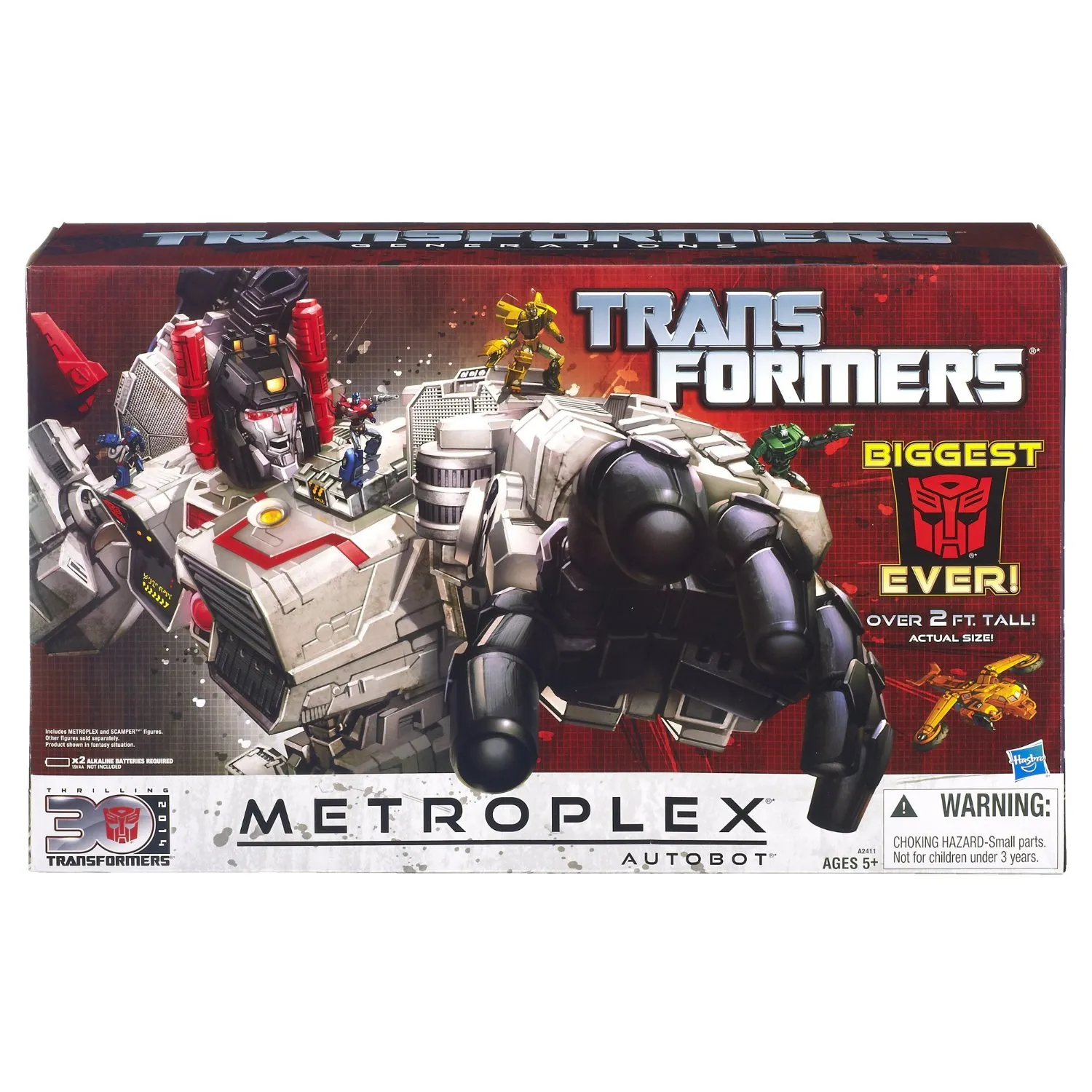 The most vast and mighty Autobot ever created, Metroplex is a member of a race long thought of as nothing more than legend. He is impossibly ancient, brought online in a time before the long memory of his Autobot comrades even began. He is a living artifact of an era when Cybertron was united and needed defenders only against hostile outsiders. It is his memory of that peaceful past that drives him to fight for the Autobots. It is hope for the return of peace that motivates him to crush every Deception he can see beneath his mighty feet. Get the biggest Autobot ever with this enormous Metroplex figure. This 3-in-1 warrior is over 2 feet tall and he's a whole city of Transformers action. He converts from a robot to vehicle mode, but he also converts to city mode with an arsenal waiting to deploy. Take aim with his missile launcher and fire it with the press of a button. His lights and sounds take the battle to a whole new level. Your Scamper figure has got his back and he converts from robot mode to vehicle mode and back. Have a citywide battle with this enormous Metroplex figure and his Scamper ally.