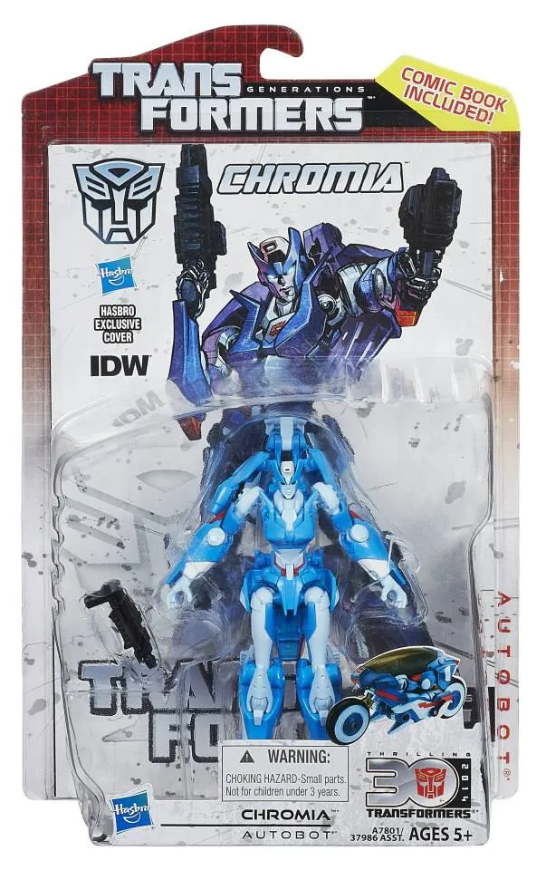 Chroma is a master of infiltration, sabotage and the kind of tactical counterstrikes that crush an opponent's morale. Unfazed by any enemy or situation, she can always be counted on to step up when her team's in a tight spot. Convert, arm and attack with all the Transformers action you can handle! This Chroma figure is a hardcore warrior in robot mode with a blaster in each hand for battle against Deception foes. When she needs to chase down does, she can convert to motorcycle mode! Whatever mode your Chroma figure is in, her enemies will think twice before taking her on! Transformers and all related characters are trademarks of Hasbro.
