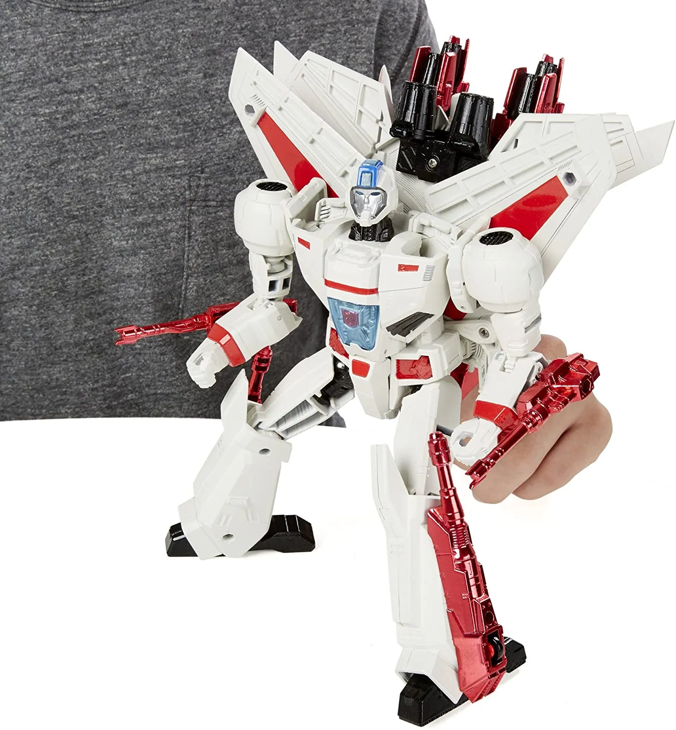 Bring home a big, transforming jet from space! The Transformers Generations Thrilling 30 Leader Jetfire stands tall above all Autobots, and this massive scientist features swappable faces - so he can look like Jetfire from his many various reincarnations on Cybertron and elsewhere. With huge chrome red guns and giant engines, Jetfire can travel the galaxy with his photon missile launcher and hunt down Decepticons while mapping space for Cybertron.