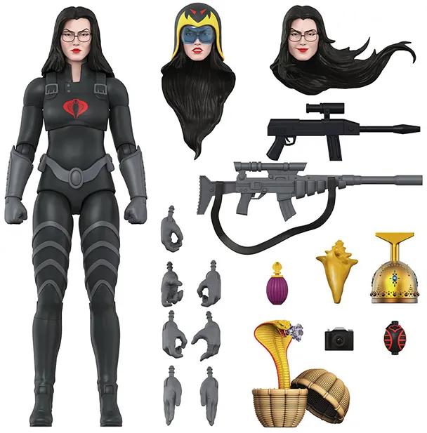 Her beauty is matched only by her ruthlessness, making Baroness one of Cobra’s most dangerous intelligence operatives! This 7-inch scale G.I. Joe ULTIMATES! figure of Baroness in her signature black suit features multiple interchangeable heads, hands and a wide assortment of accessories and weapons.