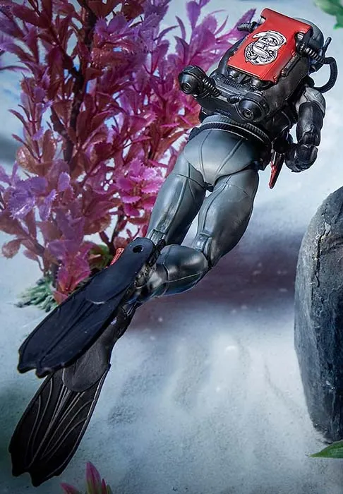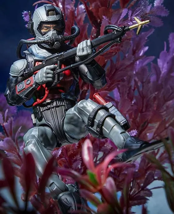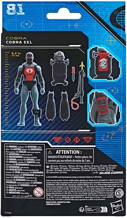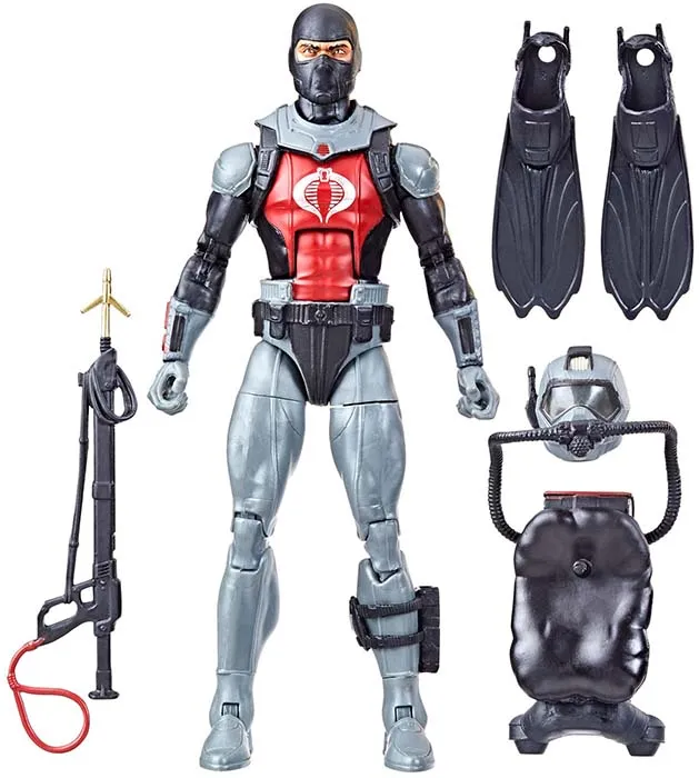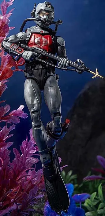New to the G.I. Joe Classified Series line, Cobra Eel comes ready for adventure, with multiple points of articulation for high poseability. This Cobra Eel figure contains 6 character-inspired accessories including a helmeted mask with breathing hoses and dive light detail, rebreather backpack with propulsion units, 2 fins, dive knife, and speargun; plus a footlocker to stow all his gear! More than 70 percent of the Earth is covered by water, and Cobra Eels serve as the frontline aquatic infantry troopers of the Cobra forces. Emerging from the murky depths they spread terror and wreak havoc.