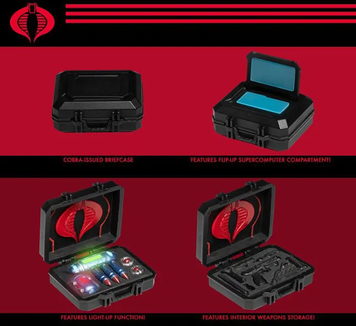 Destro is always carrying his Cobra-issued, multilayer briefcase with light-up function. The briefcase illuminates via an on/off switch and is complete with a supercomputer and weapon storage.