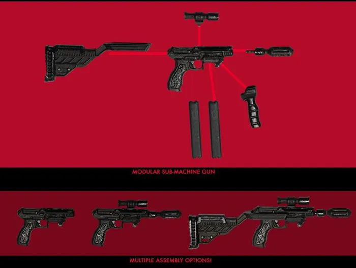 The state-of-the-art weapons manufacturer totes only the best of the best, complete with a prototype modular sub-machine gun, pistol with removable magazines, rifle with removable magazines, and missiles that attach to his gauntlet.