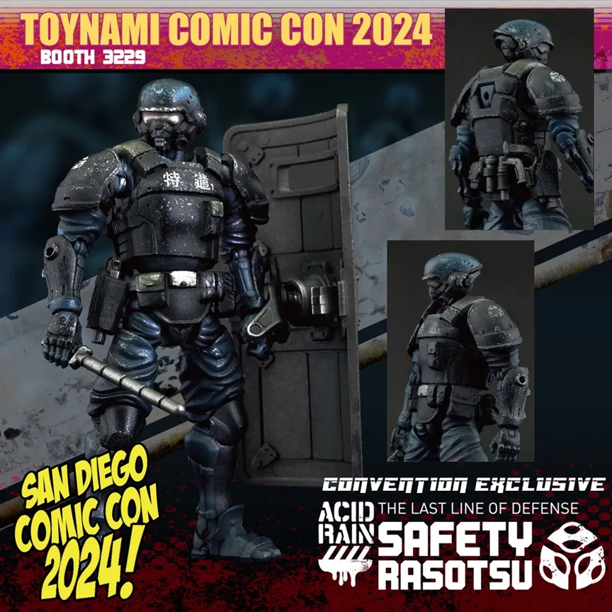 Toynami’s first convention exclusive is the Acid Rain FAV-SP29 Safety Rasotsu The Safety Rasotsu monitor, search, and strike at illegal armed forces, gangs, and rebels, ensuring the order of the nation is maintained. In the course of duty they handle special emergencies and suppress riots. Equipped with 25kg of modular heavy defensive equipment their gear includes shields, batons and flame-retardant clothing. The Safety Rasotsu figure includes and Alloy Blast Shield, Baton, Stink Grenade, Pepper Spray, and Type Chizuru Revolver.