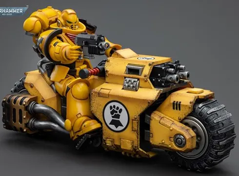 Joy Toy brings the Imperial Fists from Warhammer 40k to life with this new series of 1/18 scale figures. The Raider-Pattern Combat Bike is 8.66 inches with articulated joints and an impressive level of detail and coloring.