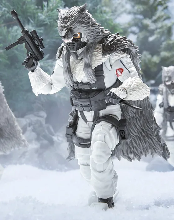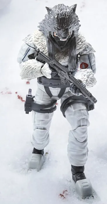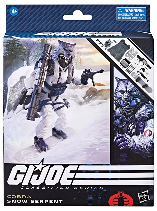 New to the G.I. Joe Classified Series line, Snow Serpent comes ready for adventure, with multiple points of articulation for high poseability. This Deluxe Snow Serpent figure contains 20 character-inspired accessories including snowboard, snowshoes, backpack, wolf pelt cape, wolf head cowl, goggles, knife, and 12 weapon accessories; plus a footlocker to stow all his gear! Snakes usually tend to be cold blooded, but Snow Serpents thrive in polar temperatures as the frontline arctic infantry troopers of the Cobra forces. They can traverse vast icy plains and then vanish in a snow drift remaining still for hours or even days only to emerge with a lethal barrage on their unsuspecting foes.