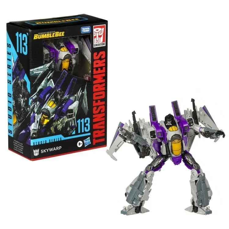 Transformers Studio Series 113 Skywarp is Voyager Class and stands approximately 6.5-inches tall in robot mode. 113 Skywarp transforms from Cybertronian Jet to robot and back and is screen accurate to the Transformers: Bumblebee live action movie. Each Studio Series figure jumps out of the big screen and into your collection with a high attention to detail and accurate color schemes reflecting their appearance in the Transformers live action movie.