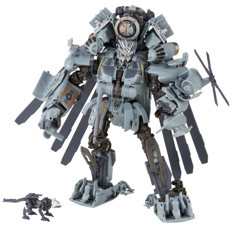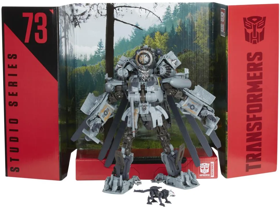 Transformers Studio Series 73 Grindor and Ravage is Leader Class and stands approximately 8.5-inches tall in robot mode. 73 Grindor and Ravage transforms from Helicopter to robot and back and is screen accurate to the Transformers: Revenge Of The Fallen live action movie. Each Studio Series figure jumps out of the big screen and into your collection with a high attention to detail and accurate color schemes reflecting their appearance in the Transformers live action movie.