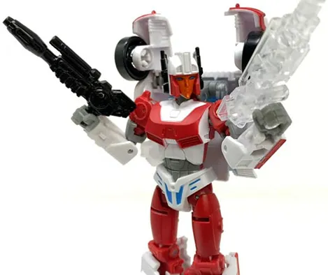 This figure is a white and red redeco of the Legacy Elita-1 mold with a new head inspired by Minerva from the G1 Japanese Masterforce cartoon and new siren lights for the vehicle mode roof.