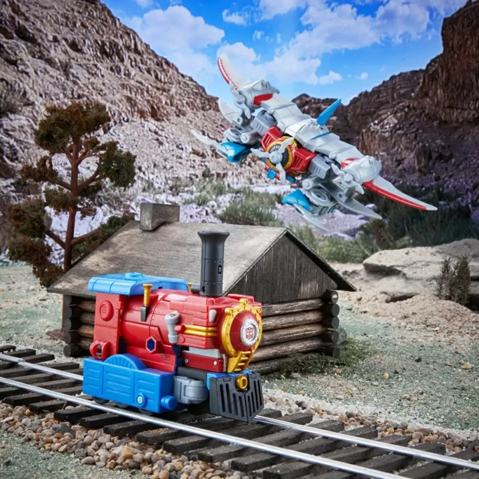 The articulated converting figures feature comic-accurate deco and details. The 5 1/2-inch Optimus Prime toy converts between robot and steam engine modes in 19 steps. The 5-inch Starscream toy converts between robot and steam flying machine mode in 18 steps. They come with an ion blaster smokestack, train roof shield, and 2 gatling blaster accessories