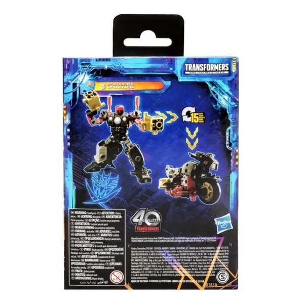 This 5.5-inch Star Raider Road Pig action figure converts between robot and motorcycle modes in 15 steps. The figure has detachable pieces that include 2 saddlebags, tire, 2 exhaust pipes, 2 arms, and 2 legs. The Star Raider Road Pig figure is inspired by the character from Transformers lore and features articulated head, arms, and legs for awesome action poses.