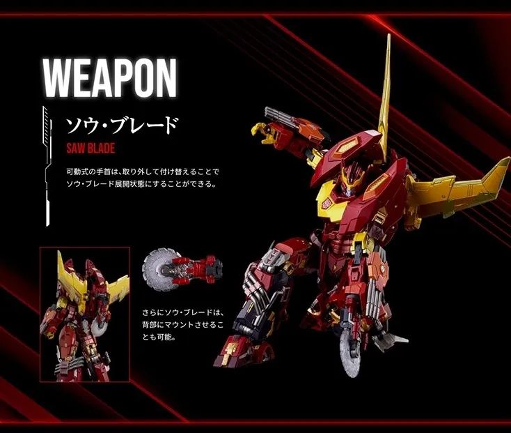 The two pairs of photon lasers included can be used as two handheld pistols, or combined to form a large gun, the Photon Eliminator. The movable wrists can be removed and replaced to deploy the saw blade. Also included is a handheld communicator (communication device) that was often depicted in the comics. All accessories can be attached to the main body in both forms without excess.