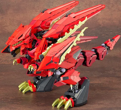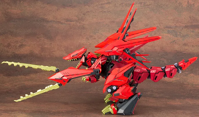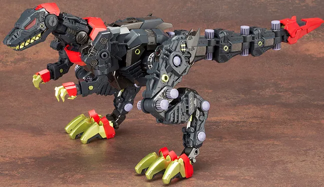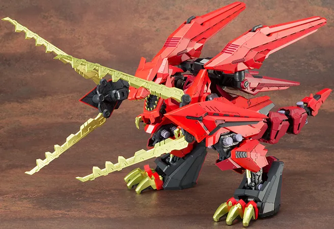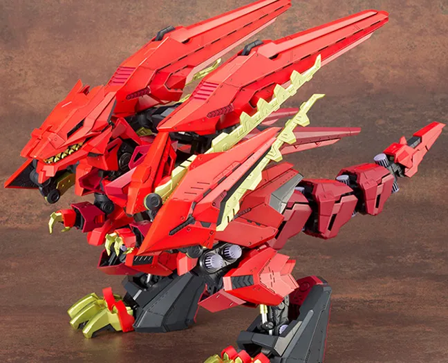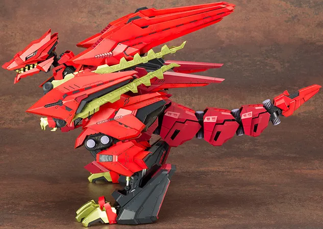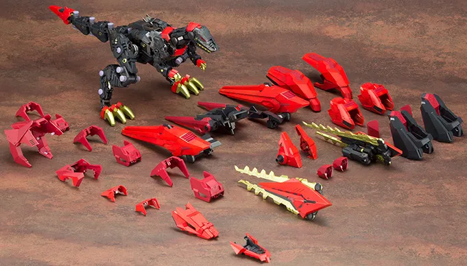 The Zoid Core inside the model’s torso can be removed. The barrel in the mouth, head armor, tail armor, and heel anchor can be extended in order to recreate the Charged Particle Cannon attack mode.