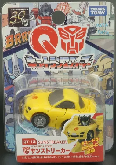 Transformes Q-Series is a Japanese Transformers exclusive series released only in Japan by Takara Tomy. The Q is an abreviated version of the word Cute and this series is an extension of Takara Tomy's Choro-Q which is a style of super deformed cars that are highly collectible. In the case of Transformers Q-Series each figure features a famous Transformers character from either Generation 1, the Transformers Live Action Movies or the Transformers Alternity Series that transforms from a car into each character's robot mode.