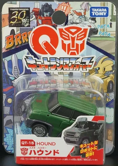 Hound is a super mini sized Transformers Q-Series figure that stands approximately 2" tall in robot mode. Figure transforms from robot to Sport Utility Vehicle and back.