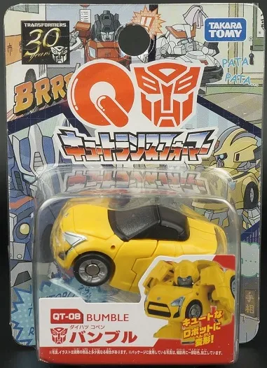 Transformes Q-Series is a Japanese Transformers exclusive series released only in Japan by Takara Tomy. The Q is an abreviated version of the word Cute and this series is an extension of Takara Tomy's Choro-Q which is a style of super deformed cars that are highly collectible. In the case of Transformers Q-Series each figure features a famous Transformers character from either Generation 1, the Transformers Live Action Movies or the Transformers Alternity Series that transforms from a car into each character's robot mode.