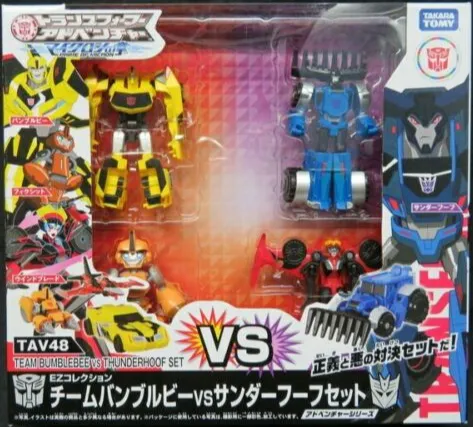 TAV48 Bumble Bee Vs Thunder Hoof Set is a Japanese Exclusive figure released by Takara Tomy in Japan. TAV48 Bumble Bee Vs Thunder Hoof Set is a Japanese recolored version of the US Transformers Robot in Disguise figure.