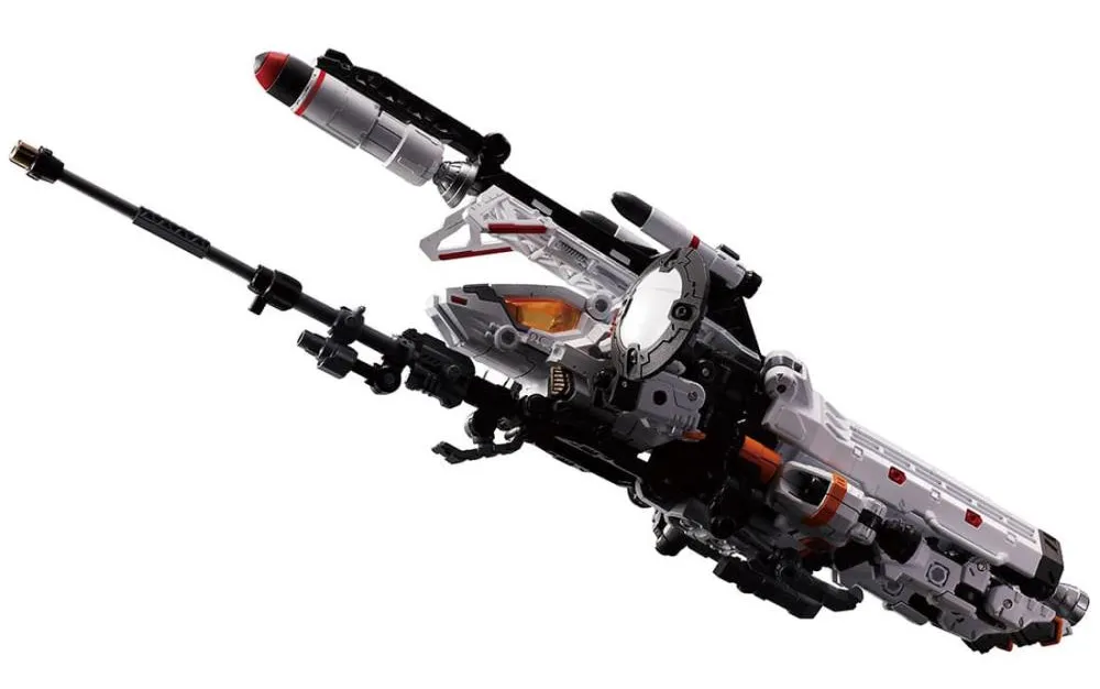 This tactical mover machine is designed for space maneuvers and has a huge white body propulsion unit on its back. A missile launch unit is equipped in the center of the propulsion unit, and the hand-held weapon is a long-range rifle. It features integrated transformation into three different modes: the machine form with a long-range rifle attached to the front, a heavy-duty mecha form with two huge arms, and a humanoid combat form that demonstrates maximum combat ability!