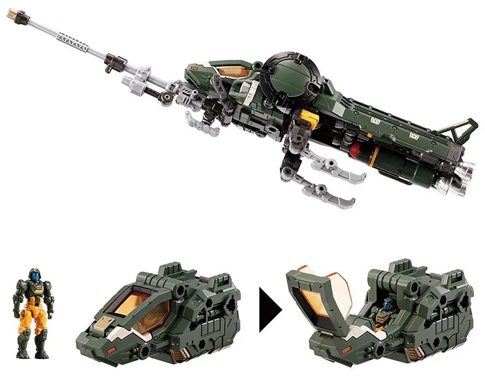 A set of Orbisopter Unit and Bullet Module and Weapon wearing the Space Marine Corps color. Equipped with a missile launch launch in the center of the unit. Armed with a long range blater. One mini action figure Diaclone member Ver.2.0 is included.