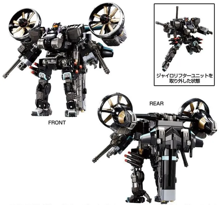 A new machine that boasts one of the largest volumes in the Tactical Mover series is now available in black color! The gyro lifter unit is a tiltrotor type unit with two gyros. The lift arm at the rear of the unit is equipped with a 2-wheel vehicle! The body color is black. One Diaclone member Ver. 4.2 is included.